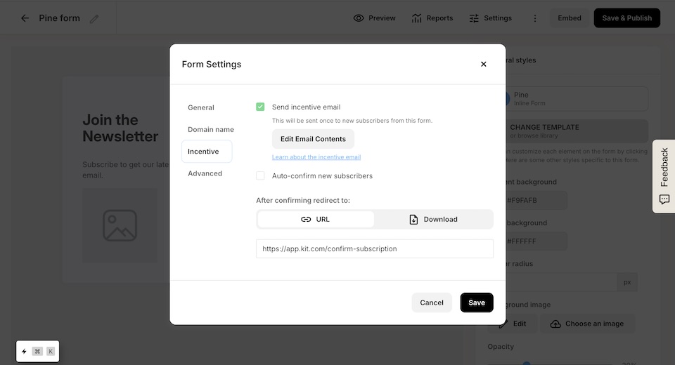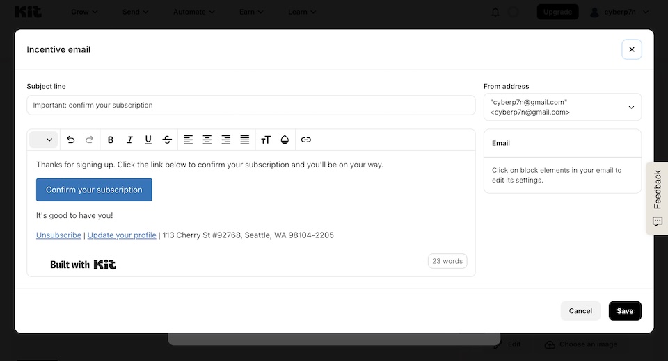 在 ConvertKit 中,你可以透過 Incentive Email(驗證信)